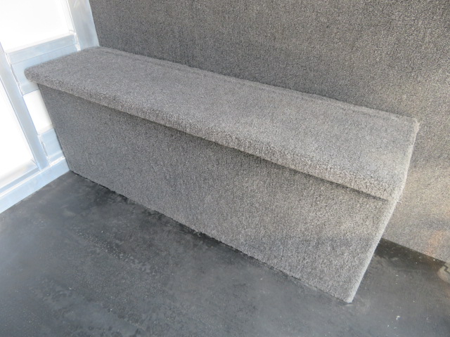 The 3-foot tack room with swing-out saddle rack provides organized storage. The rack pivots out for easy saddle placement, then swings back to secure position. Boot box keeps footwear organized and separate from other gear. Water tank ensures fresh water availability during trips.
